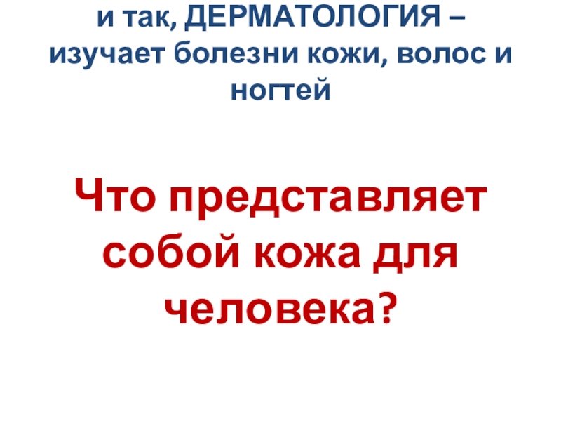 Слайд 15и так, ДЕРМАТОЛОГИЯ – изучает болезни кожи, волос и ногтей