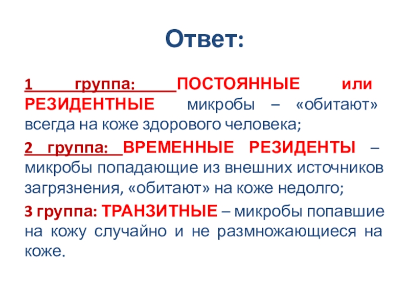 1 группа: ПОСТОЯННЫЕ или РЕЗИДЕНТНЫЕ микробы – «обитают» всегда на коже