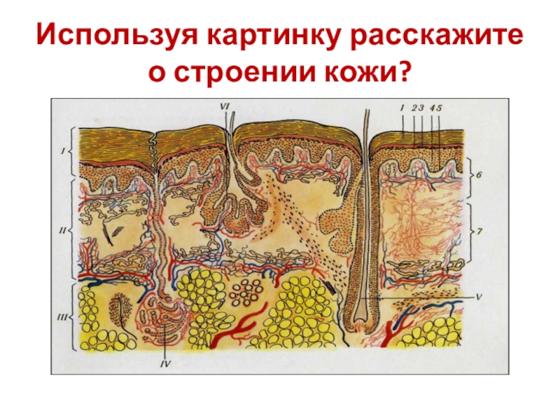 Слайд 17Используя картинку расскажите о строении кожи?