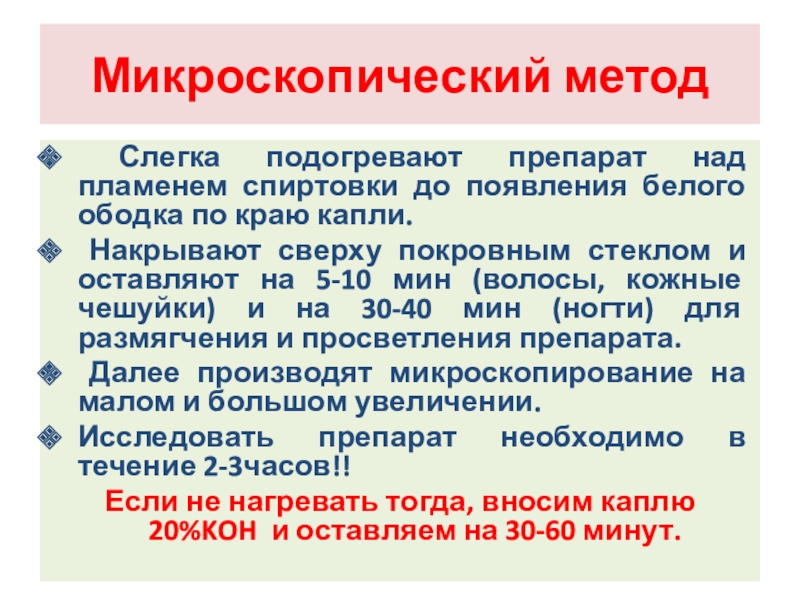 Накрывают сверху покровным стеклом и оставляют на 5-10 мин (волосы, кожные чешуйки) и на 30-40 мин (ногти) для размягчения и просветления препарата.