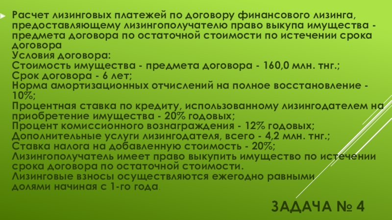 Расчет лизинговых платежей по договору финансового лизинга, предоставляющему лизингополучателю