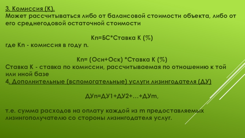 определяемая при принятии объекта к учету (во многом зависит от срока эксплуатации объекта); БС - стоимость объекта по балансу, непосредственно предмет лизинговой сделки.