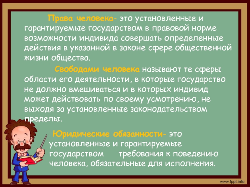 Права человека- это установленные и гарантируемые государством в правовой норме возможности индивида совершать определенные действия в указанной в законе сфере общественной жизни общества.