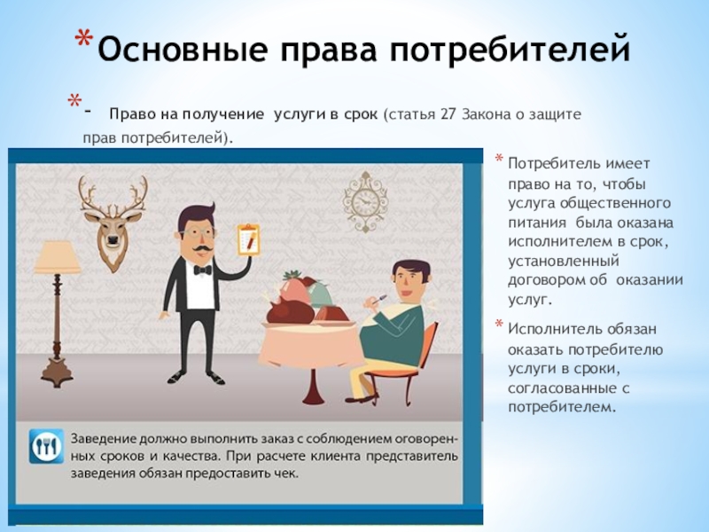 Потребитель имеет право на то, чтобы услуга общественного питания была оказана исполнителем в срок, установленный договором об оказании услуг.