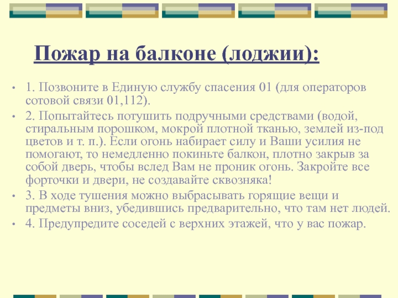 2. Попытайтесь потушить подручными средствами (водой, стиральным порошком, мокрой плотной тканью, землей из-под цветов и т. п.). Если огонь набирает силу и Ваши усилия не помогают, то немедленно покиньте балкон, плотно закрыв за собой дверь, чтобы вслед Вам не проник огонь. Закройте все форточки и двери, не создавайте сквозняка!
