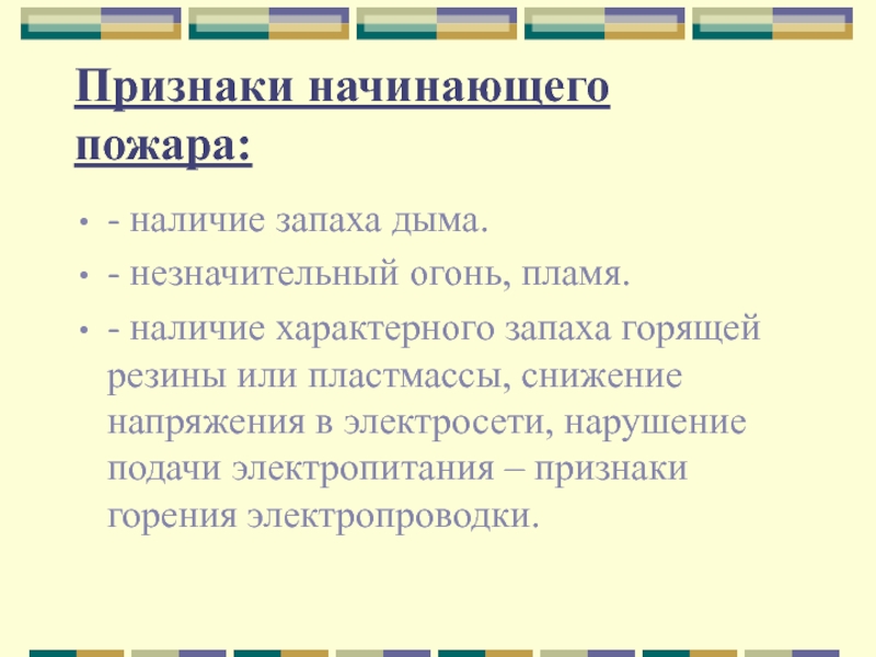 характерного запаха горящей резины или пластмассы, снижение напряжения в электросети, нарушение подачи электропитания – признаки горения электропроводки.
