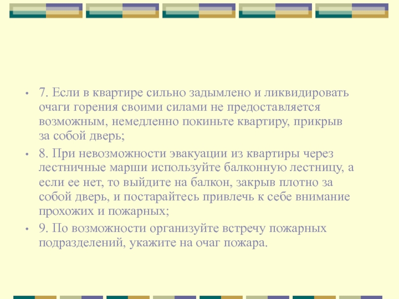 8. При невозможности эвакуации из квартиры через лестничные марши используйте балконную лестницу, а если ее нет, то выйдите на балкон, закрыв плотно за собой дверь, и постарайтесь привлечь к себе внимание прохожих и пожарных;