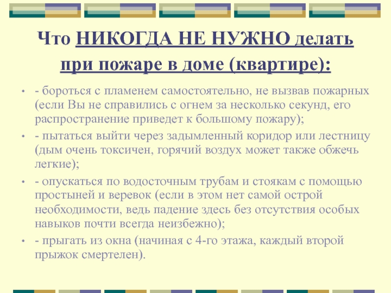 Слайд 9Что НИКОГДА НЕ НУЖНО делать при пожаре в доме (квартире):