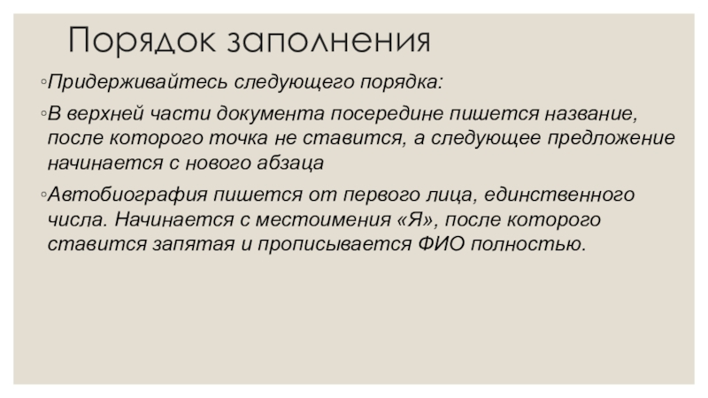 Автобиография пишется от первого лица, единственного числа. Начинается с местоимения «Я», после которого ставится запятая и прописывается ФИО полностью.