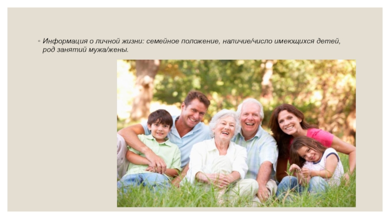 Слайд 11Информация о личной жизни: семейное положение, наличие/число имеющихся детей, род занятий