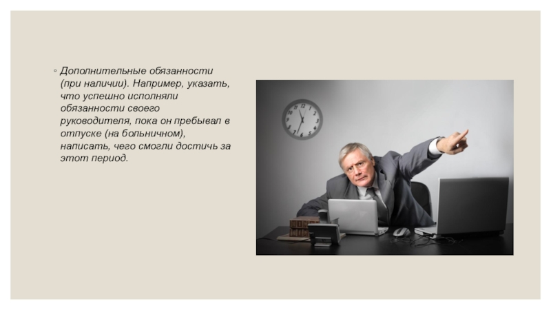 Слайд 9Дополнительные обязанности (при наличии). Например, указать, что успешно исполняли обязанности своего