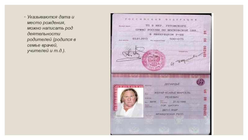 Слайд 5Указываются дата и место рождения, можно написать род деятельности родителей (родился