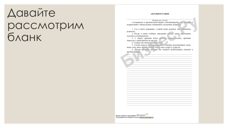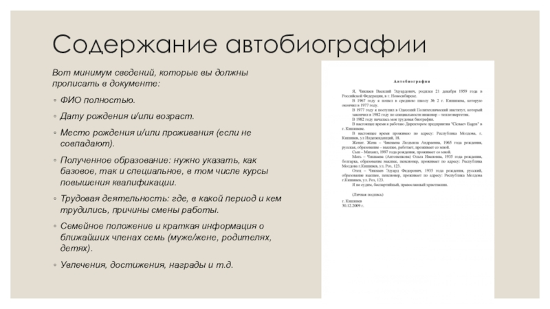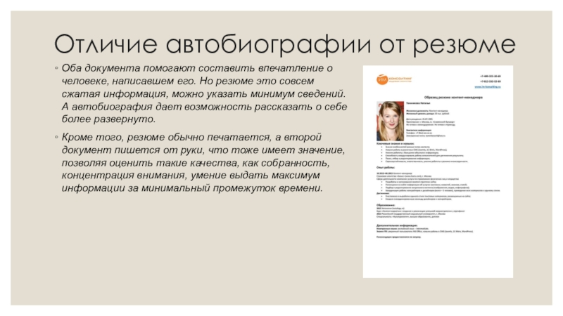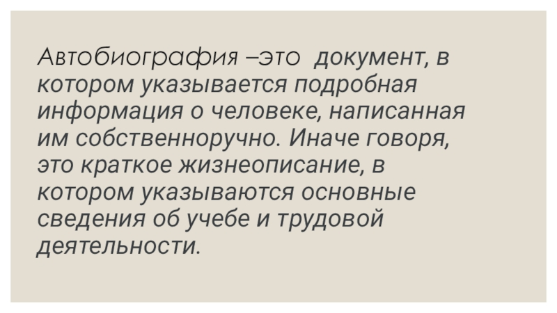 Слайд 2Автобиография –это документ, в котором указывается подробная информация о человеке, написанная