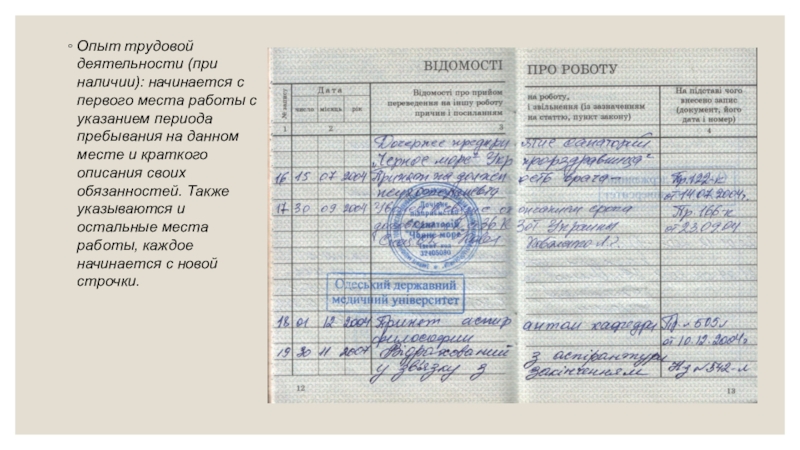 Слайд 7Опыт трудовой деятельности (при наличии): начинается с первого места работы с