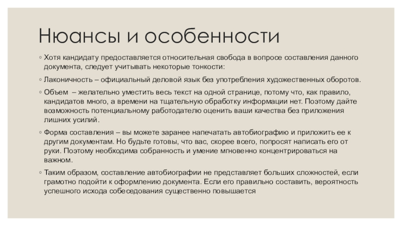 Таким образом, составление автобиографии не представляет больших сложностей, если грамотно подойти к оформлению документа. Если его правильно составить, вероятность успешного исхода собеседования существенно повышается