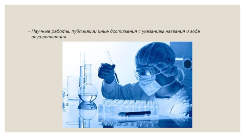 Слайд 8Научные работы, публикации иные достижения с указанием названия и года осуществления.