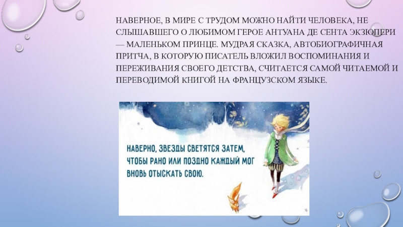 любимом герое Антуана де Сента Экзюпери — Маленьком принце. Мудрая сказка, автобиографичная притча, в которую писатель вложил воспоминания и переживания своего детства, считается самой читаемой и переводимой книгой на французском языке.