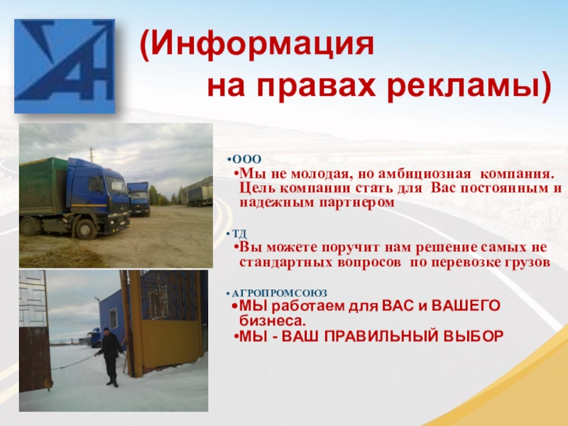 Проинформировать организации и частные лица о существовании на рынке грузоперевозок компании ООО ТД «Агропромсоюз»