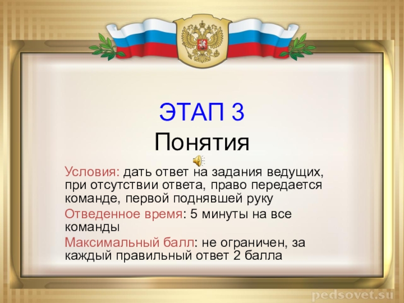 ЭТАП 3 ПонятияУсловия: дать ответ на задания ведущих, при отсутствии ответа, право передается команде, первой поднявшей рукуОтведенное
