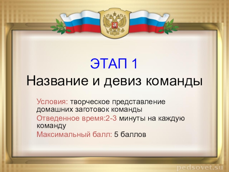 ЭТАП 1 Название и девиз командыУсловия: творческое представление домашних заготовок командыОтведенное время:2-3 минуты на каждую командуМаксимальный балл: 5 баллов