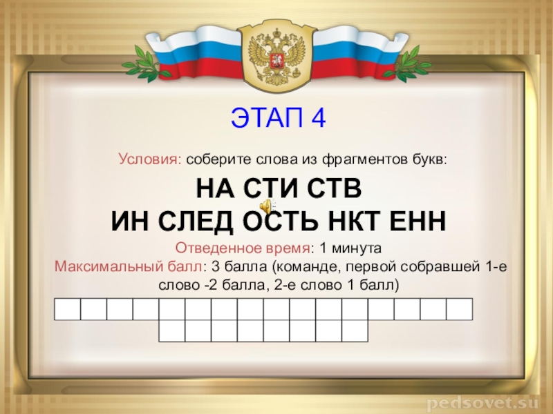 СЛЕД ОСТЬ НКТ ЕНН Отведенное время: 1 минута Максимальный балл: 3 балла (команде, первой собравшей 1-е слово -2 балла, 2-е слово 1 балл)