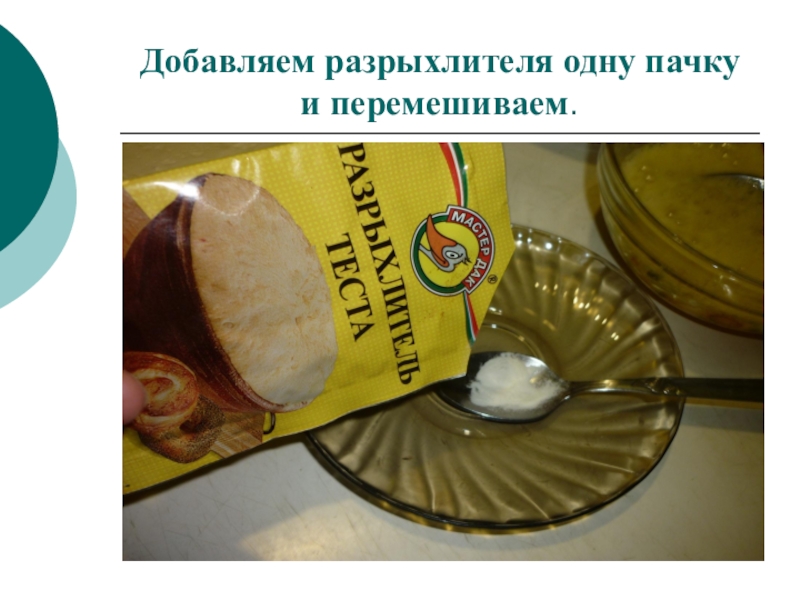 Слайд 12Добавляем разрыхлителя одну пачку и перемешиваем.