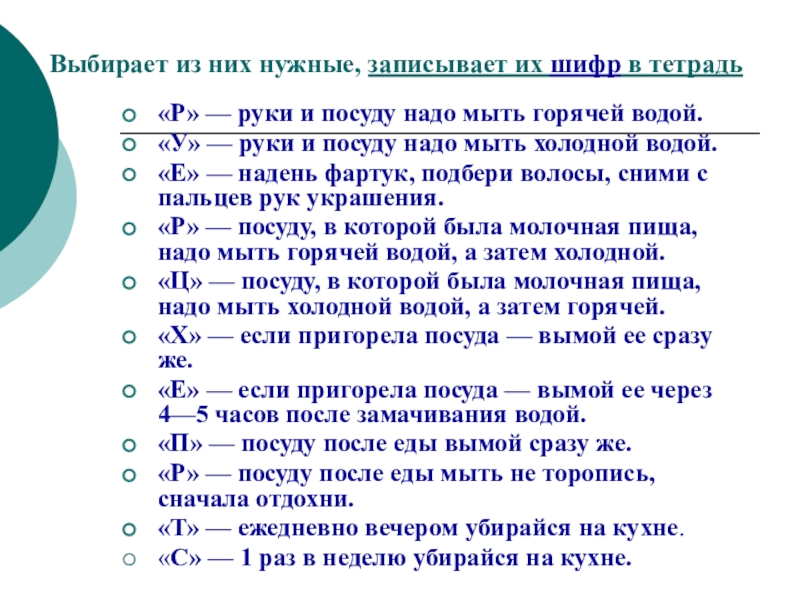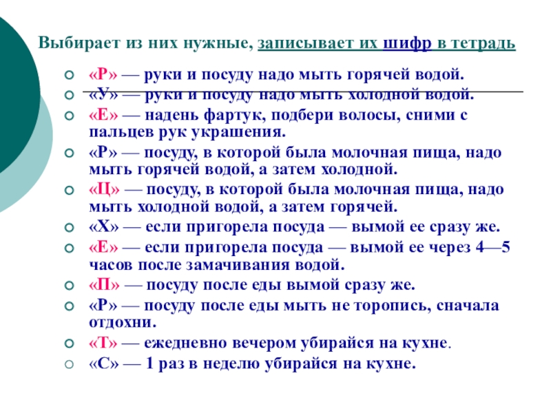«Р» — посуду, в которой была молочная пища, надо мыть горячей водой, а затем холодной.