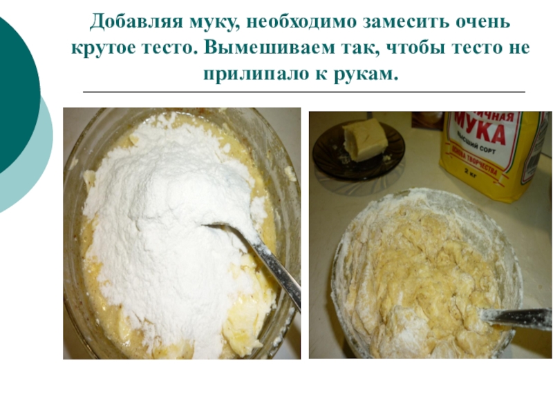 Слайд 14Добавляя муку, необходимо замесить очень крутое тесто. Вымешиваем так, чтобы тесто
