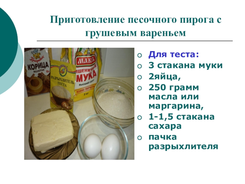 Слайд 9Приготовление песочного пирога с грушевым вареньем