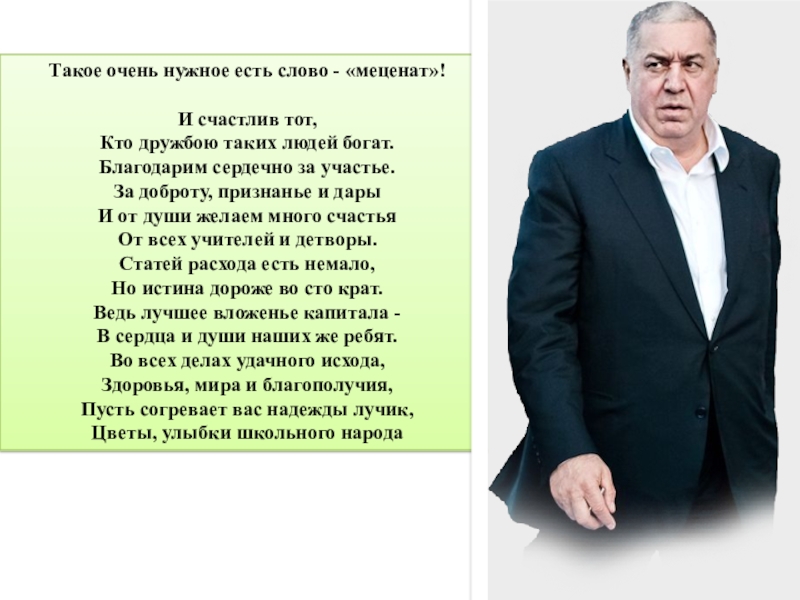 Такое очень нужное есть слово - «меценат»!И счастлив тот,Кто дружбою таких людей богат.Благодарим сердечно за участье.За доброту,