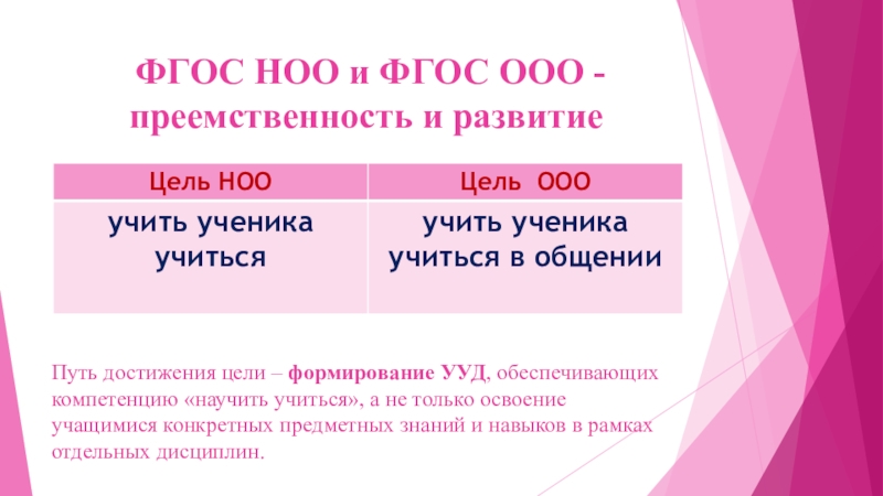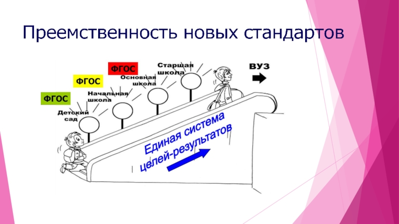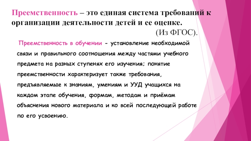 Преемственность в обучении - установление необходимой связи и правильного соотношения между частями учебного предмета на разных ступенях его изучения; понятие преемственности характеризует также требования, предъявляемые к знаниям, умениям и УУД учащихся на каждом этапе обучения, формам, методам и приёмам объяснения нового материала и ко всей последующей работе по его усвоению.