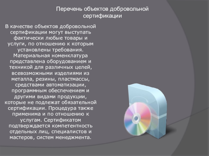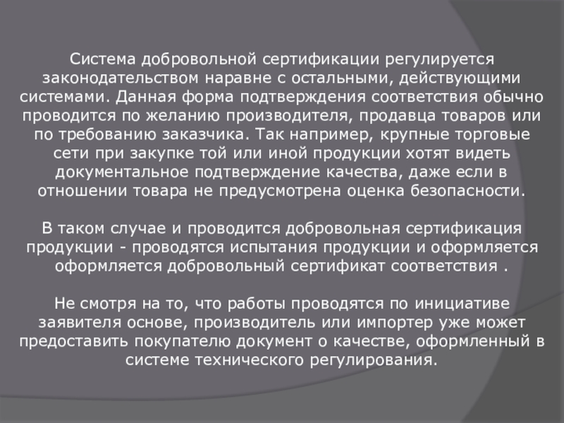 Слайд 3Система добровольной сертификации регулируется законодательством наравне с остальными, действующими системами. Данная