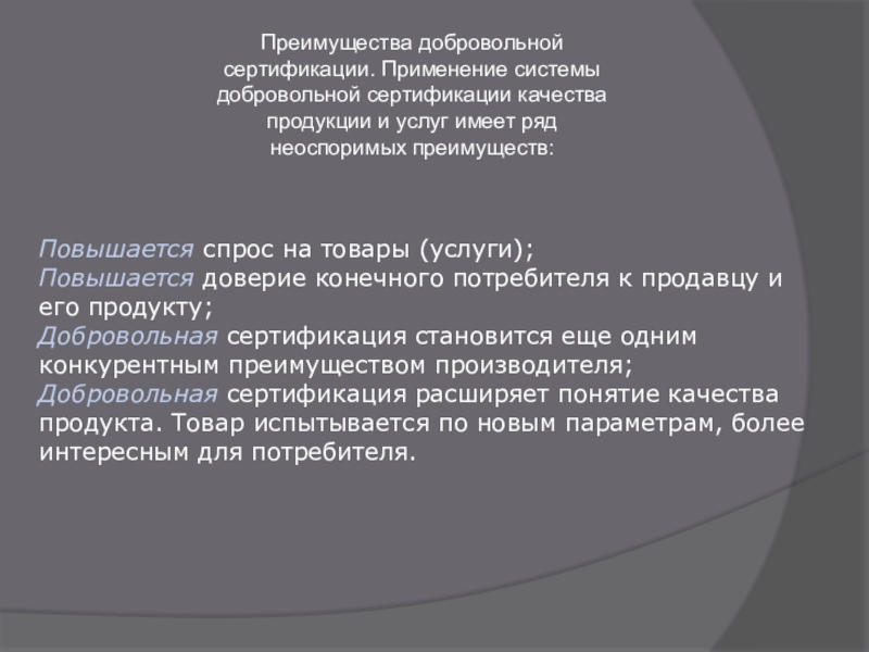 Слайд 11Преимущества добровольной сертификации. Применение системы добровольной сертификации качества продукции и услуг
