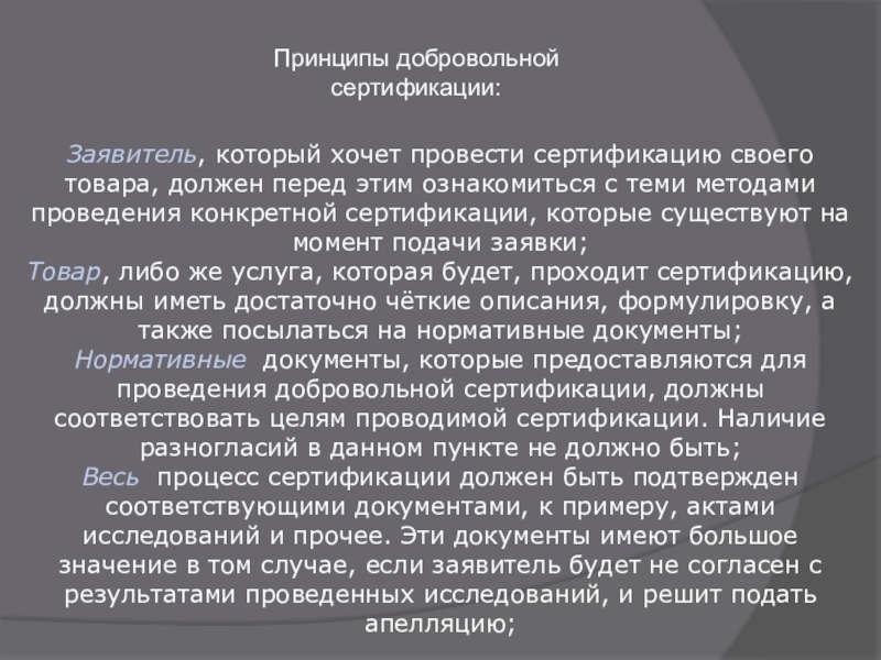Товар, либо же услуга, которая будет, проходит сертификацию, должны иметь достаточно чёткие описания, формулировку, а также посылаться на нормативные документы;