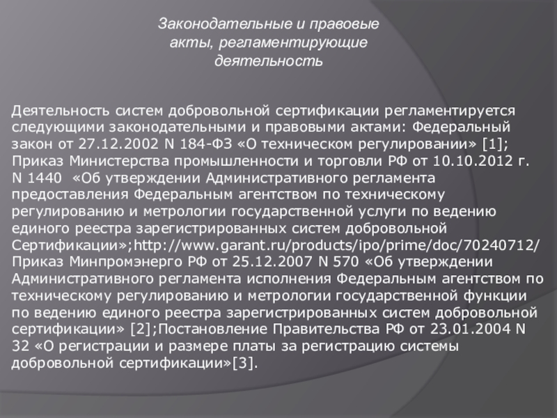 законодательными и правовыми актами: Федеральный закон от 27.12.2002 N 184-ФЗ «О техническом регулировании» [1];Приказ Министерства промышленности и торговли РФ от 10.10.2012 г. N 1440 «Об утверждении Административного регламента предоставления Федеральным агентством по техническому регулированию и метрологии государственной услуги по ведению единого реестра зарегистрированных систем добровольной Сертификации»;http://www.garant.ru/products/ipo/prime/doc/70240712/Приказ Минпромэнерго РФ от 25.12.2007 N 570 «Об утверждении Административного регламента исполнения Федеральным агентством по техническому регулированию и метрологии государственной функции по ведению единого реестра зарегистрированных систем добровольной сертификации» [2];Постановление Правительства РФ от 23.01.2004 N 32 «О регистрации и размере платы за регистрацию системы добровольной сертификации»[3].