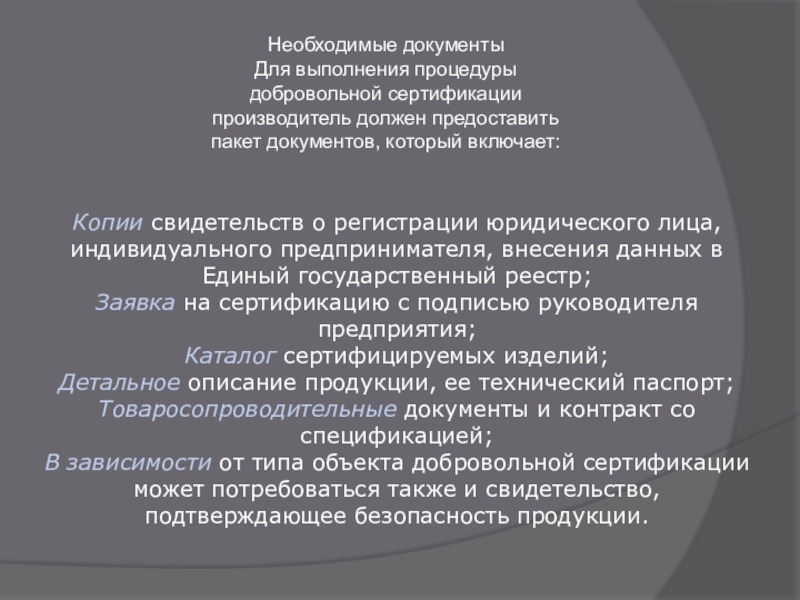Для выполнения процедуры добровольной сертификации производитель должен предоставить пакет документов,