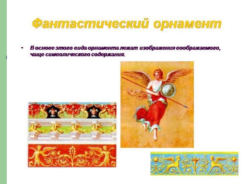 В основе фантастического орнамента лежат выдуманные изображения, чаще  символического и мифологического содержания.	 Особенное распространение фантастический орнамент с изображениями