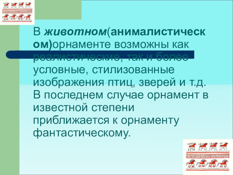 В животном(анималистическом)орнаменте возможны как реалистические, так и более условные, стилизованные изображения птиц, зверей и т.д. В последнем случае