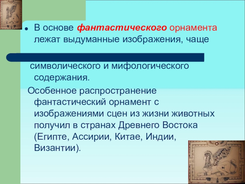 Слайд 7В основе фантастического орнамента лежат выдуманные изображения, чаще