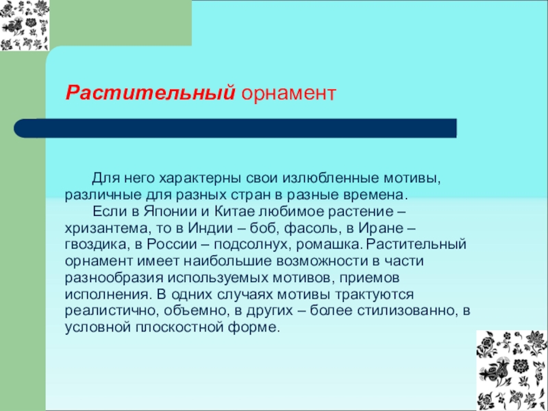 разные времена. Если в Японии и Китае любимое растение – хризантема, то в Индии – боб, фасоль, в Иране – гвоздика, в России – подсолнух, ромашка. Растительный орнамент имеет наибольшие возможности в части разнообразия используемых мотивов, приемов исполнения. В одних случаях мотивы трактуются реалистично, объемно, в других – более стилизованно, в условной плоскостной форме.