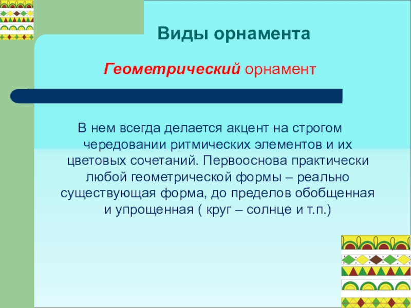 Виды орнаментаГеометрический орнаментВ нем всегда делается акцент на строгом чередовании ритмических элементов и