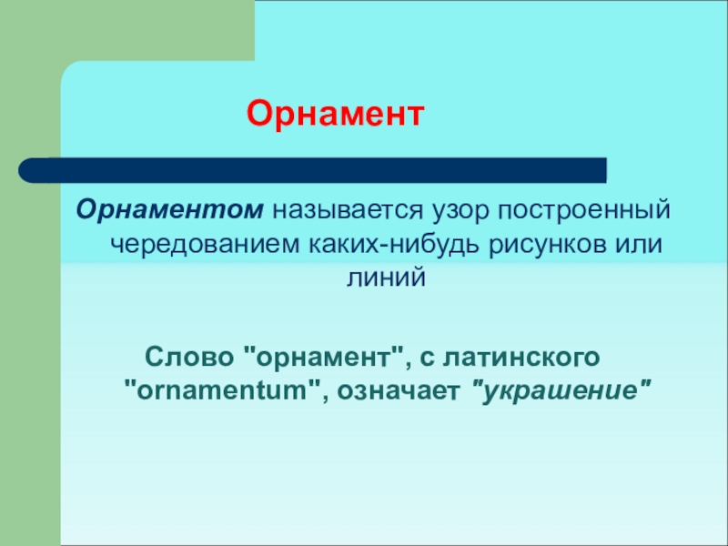 ОрнаментОрнаментом называется узор построенный чередованием каких-нибудь рисунков или линийСлово "орнамент", с латинского "ornamentum", означает "украшение"