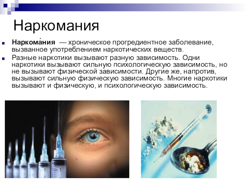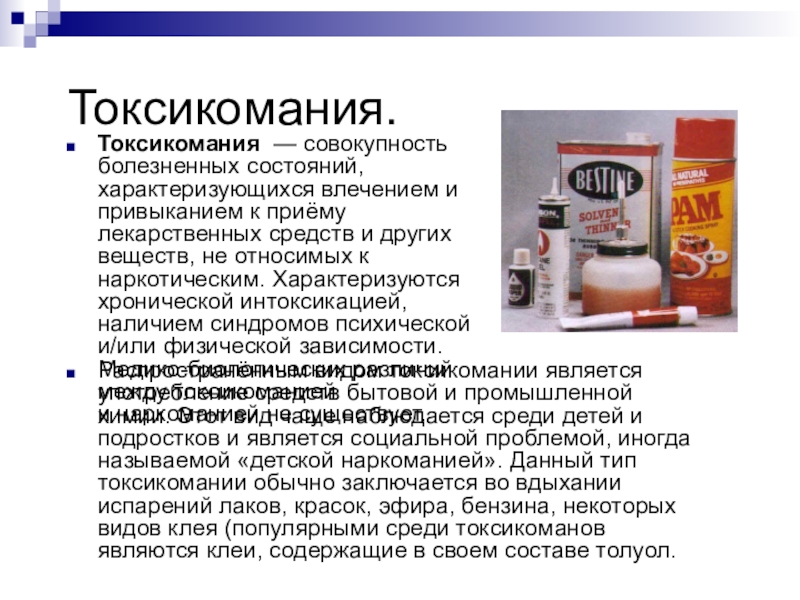 Токсикомания — совокупность болезненных состояний, характеризующихся влечением и привыканием к приёму лекарственных средств и других веществ, не относимых к наркотическим. Характеризуются хронической интоксикацией, наличием синдромов психической и/или физической зависимости. Медико-биологических различий между токсикоманией и наркоманией не существует.
