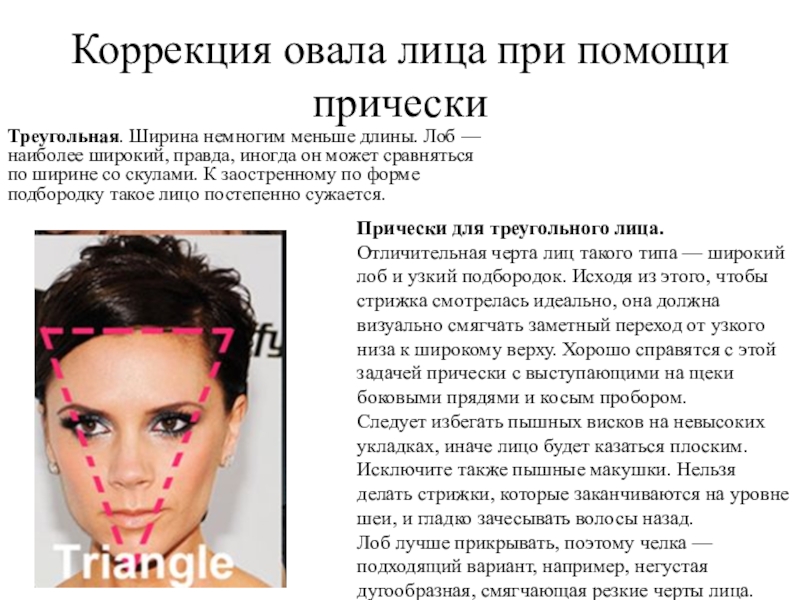 Прически для треугольного лица. Отличительная черта лиц такого типа — широкий лоб и узкий подбородок. Исходя из этого, чтобы стрижка смотрелась идеально, она должна визуально смягчать заметный переход от узкого низа к широкому верху. Хорошо справятся с этой задачей прически с выступающими на щеки боковыми прядями и косым пробором.