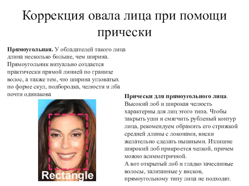 Прически для прямоугольного лица. Высокий лоб и широкая челюсть характерны для лиц этого типа. Чтобы закрыть уши и смягчить рубленый контур лица, рекомендуем обрамить его стрижкой средней длины с локонами, виски желательно сделать пышными. Излишне широкий лоб прикроется челкой, причем можно асимметричной.