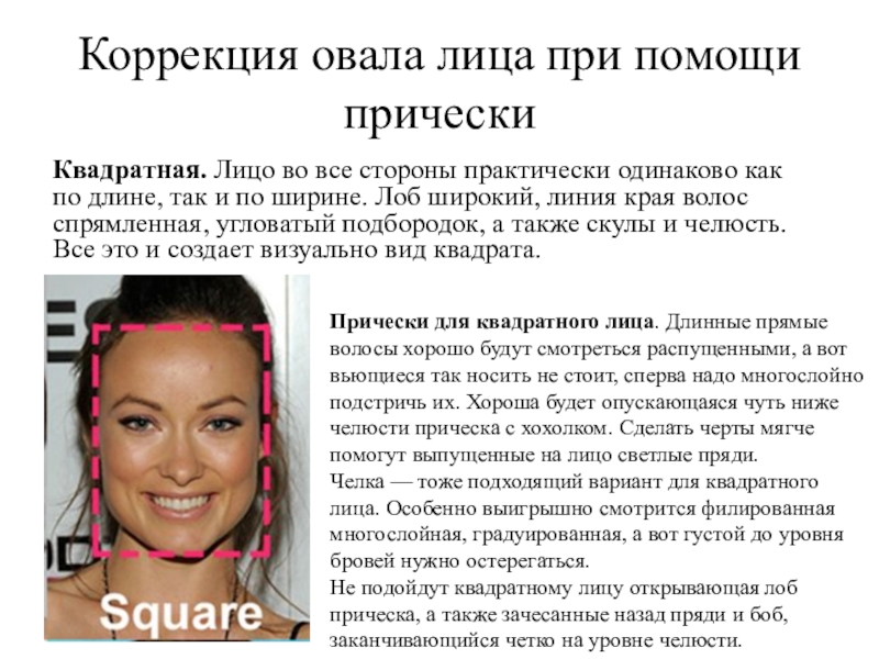 Прически для квадратного лица. Длинные прямые волосы хорошо будут смотреться распущенными, а вот вьющиеся так носить не стоит, сперва надо многослойно подстричь их. Хороша будет опускающаяся чуть ниже челюсти прическа с хохолком. Сделать черты мягче помогут выпущенные на лицо светлые пряди.