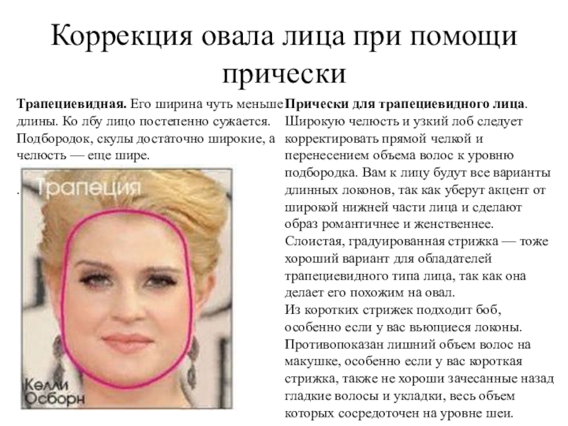 Прически для трапециевидного лица. Широкую челюсть и узкий лоб следует корректировать прямой челкой и перенесением объема волос к уровню подбородка. Вам к лицу будут все варианты длинных локонов, так как уберут акцент от широкой нижней части лица и сделают образ романтичнее и женственнее.