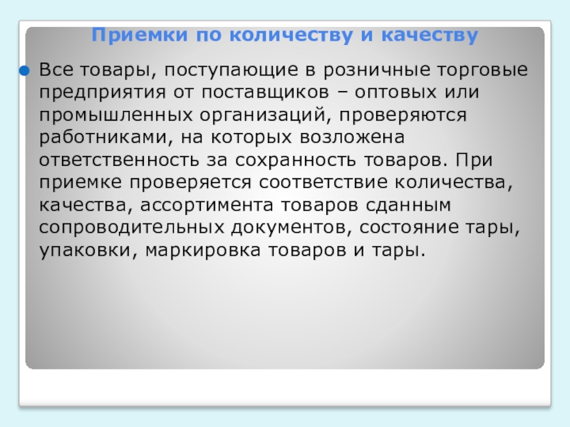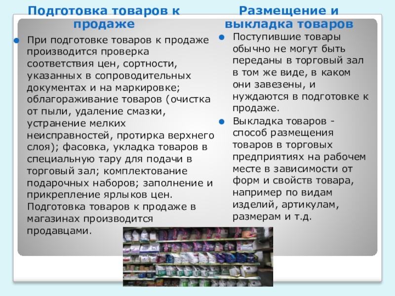 Поступившие товары обычно не могут быть переданы в торговый зал в том же виде, в каком они завезены, и нуждаются в подготовке к продаже.