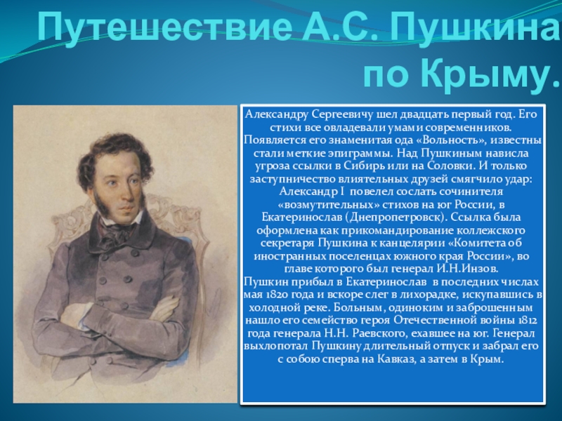 стихи все овладевали умами современников. Появляется его знаменитая ода «Вольность», известны стали меткие эпиграммы. Над Пушкиным нависла угроза ссылки в Сибирь или на Соловки. И только заступничество влиятельных друзей смягчило удар: Александр I повелел сослать сочинителя «возмутительных» стихов на юг России, в Екатеринослав (Днепропетровск). Ссылка была оформлена как прикомандирование коллежского секретаря Пушкина к канцелярии «Комитета об иностранных поселенцах южного края России», во главе которого был генерал И.Н.Инзов.