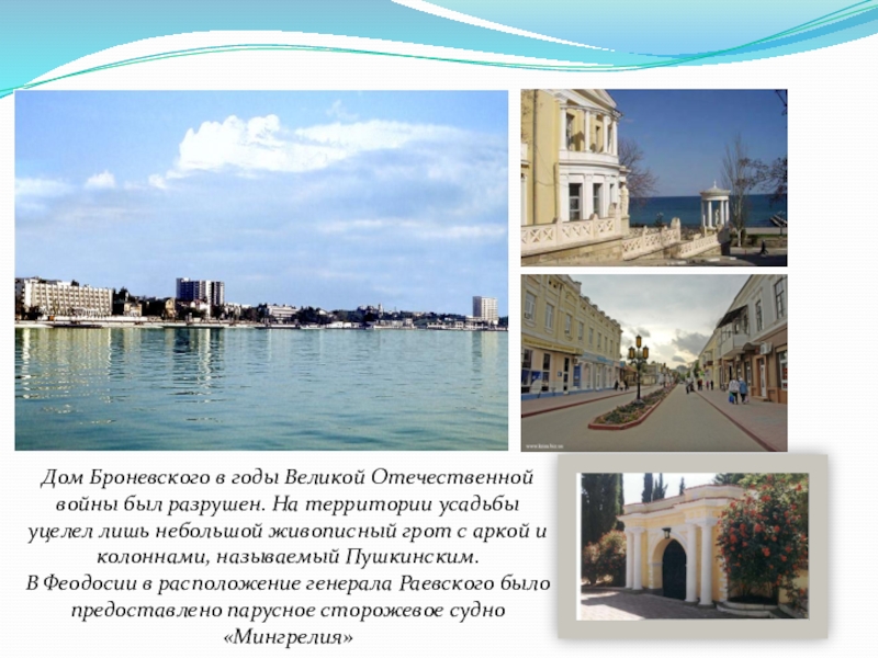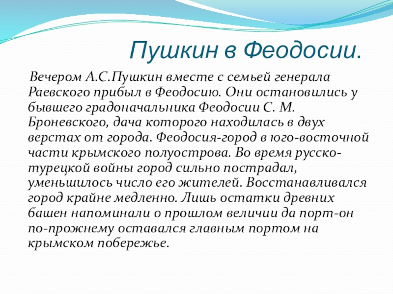 прибыл в Феодосию. Они остановились у бывшего градоначальника Феодосии С. М. Броневского, дача которого находилась в двух верстах от города. Феодосия-город в юго-восточной части крымского полуострова. Во время русско-турецкой войны город сильно пострадал, уменьшилось число его жителей. Восстанавливался город крайне медленно. Лишь остатки древних башен напоминали о прошлом величии да порт-он по-прожнему оставался главным портом на крымском побережье.